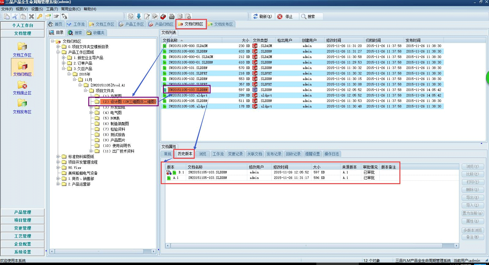 三品PDM系統(tǒng)有效管理所有圖紙及各類(lèi)文檔資料,圖檔在修改及變更后會(huì)在系統(tǒng)中產(chǎn)生新的版本/版次,即升版,歷史版本信息見(jiàn)下圖: