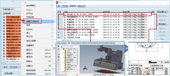 1、設(shè)計(jì)人員提交圖紙:設(shè)計(jì)人員完成圖紙?jiān)O(shè)計(jì)并自檢后,在三品PLM系統(tǒng)中通過“創(chuàng)建工作流”功能將圖紙?zhí)峤唤o相關(guān)部門或負(fù)責(zé)人啟動(dòng)審核流程。