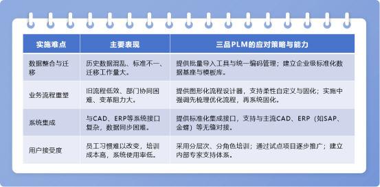 下表概括了PLM實(shí)施的主要難點(diǎn)及三品PLM的相應(yīng)應(yīng)對(duì)策略:
