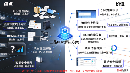 與傳統(tǒng)以文件夾共享、紙質(zhì)審批為主的管理模式相比,三品PLM系統(tǒng)體現(xiàn)出以下差異化優(yōu)勢: