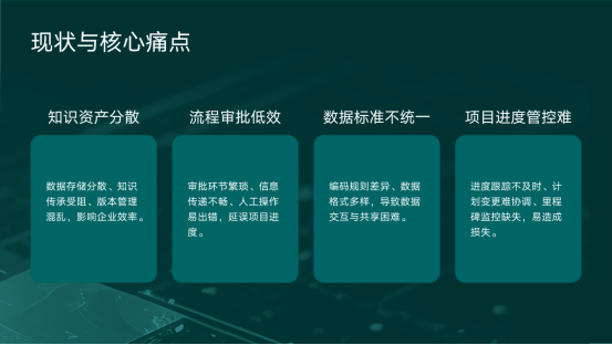 流程審批效率低下:從設(shè)計(jì)評(píng)審、圖紙發(fā)放到變更執(zhí)行,多數(shù)環(huán)節(jié)仍依靠紙質(zhì)單據(jù)與線下溝通,流程周期長(zhǎng)、節(jié)點(diǎn)不透明、追溯困難。尤其在多部門(mén)協(xié)同項(xiàng)目中,信息傳遞延遲與誤差直接影響項(xiàng)目進(jìn)度與交付質(zhì)量。