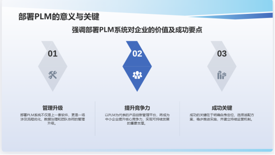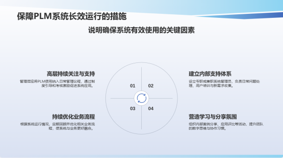●高層持續(xù)關(guān)注與支持:管理層應(yīng)將PLM使用納入日常管理議程,通過制度引導(dǎo)和考核激勵促進系統(tǒng)應(yīng)用。