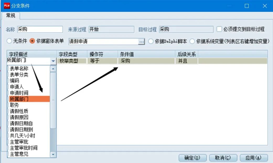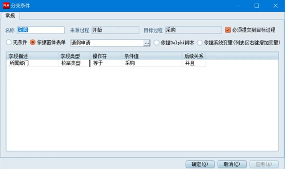 在出現的條件值上,《字段描述》選擇“所屬部門”,《條件值》選擇“采購”,勾選【必須提交到目標過程】,然后確定即可。此時條件設置完成,當用戶在《請假申請》單中所屬部門選擇“采購”時,啟動流程后自動提交到采購部進行審核。其他部門設置同樣如上。