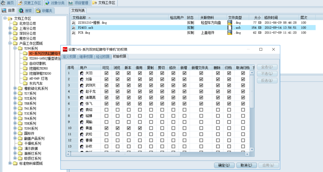 有時候,我們也需要能夠變化的權限控制,比如對于圖紙對象來說,處于未審核狀態下的訪問權限需要指定給工程師,而經過審核后的圖紙需要下發給生產人員訪問,這就是對同一個數據的不同狀態下的權限控制,這一類的權限控制就是動態的。在三品PLM中,我們可以對各類對象的不同狀態進行權限管控,對數據對象在審核活動中的不同任務階段進行權限管控。