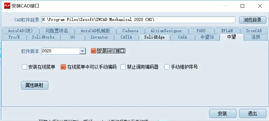 選擇“中望”的安裝目錄、軟件版本等,點 “安裝”完成接口的安裝。
