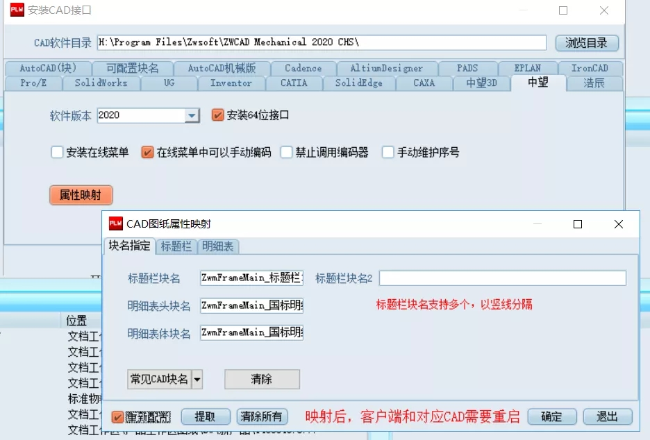 點擊“屬性映射”進行圖紙屬性和PDM物料屬性之間的映射關系設置: