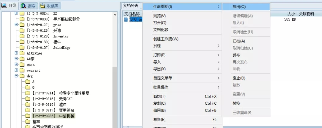從本地導入一個中望機械文件到文檔工作區,并選中它,右鍵—生命周期--檢出
