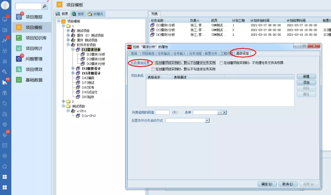 在項目管理模塊,可以對一個項目或任務的屬性界面的“高級設定”標簽頁,點擊“任務通知設置”鏈接,調出任務通知設置界面: