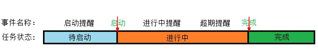 一個任務最少可以設置5個不同“事件”類型的郵件通知。為了便于大家理解通過下圖直觀說明郵件通知事件發生的階段和時機: