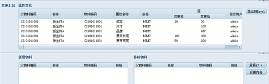 對物料、BOM的變更結果,可以在三品PLM中自動形成記錄,用戶可以查看變更前后修改內容,便于進行變更評審與核準,變更信息也可導出為表格。