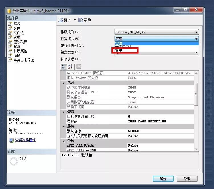 02:修改數據庫的恢復模式為“簡單”模式