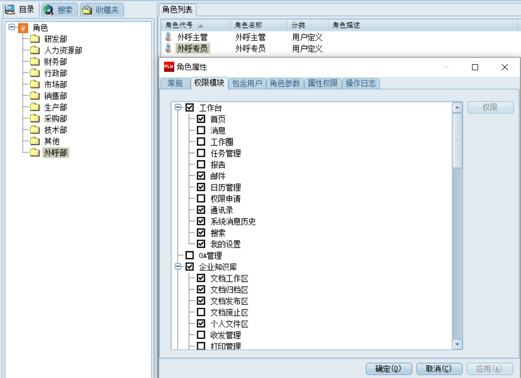 (1)系統從權限的有效性分為永久權限、臨時權限和過程權限。永久權限主要針對功能模塊,臨時權限主要針對實體型權限,過程權限則是針對任務流、工作流中的動態權限?!皺嘞薰芾怼蹦K主要管理的是永久權限和臨時權限,過程權限的控制主要由任務流的“過程角色”模塊管理。