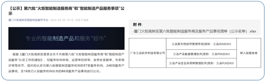 近日,第六批“火炬智能制造服務商”和“智能制造產品服務事項”正式在廈門火炬高新區智能智造服務平臺網站公示結果,三品軟件的“三品圖文檔協同管理系統[簡稱:三品EDM]V8.0、三品產品數據管理軟件[簡稱:三品PLM]V8.0、三品產品全生命周期管理軟件[簡稱:三品PLM]V8.0”三大產品成功入選,有幸成為廈門火炬高新區智能智造服務商資源池產品。